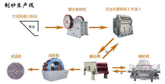 首先,石料由粗碎机(粗颚式破碎机)进行初步破碎,然后,产成的粗料由胶带输送机输送至细碎机(细碎颚式破碎机)进行进一步破碎,细碎后的石料进振动筛筛分出两种石子,满足制砂机进料粒度的石子进制砂机制砂,另一部分料返回再进细破。进制砂机的石子一部分制成砂,经洗砂机(可选)清洗后制成成品砂,另一部分进制砂机再次破碎,最终产出符合要求的各种砂料。